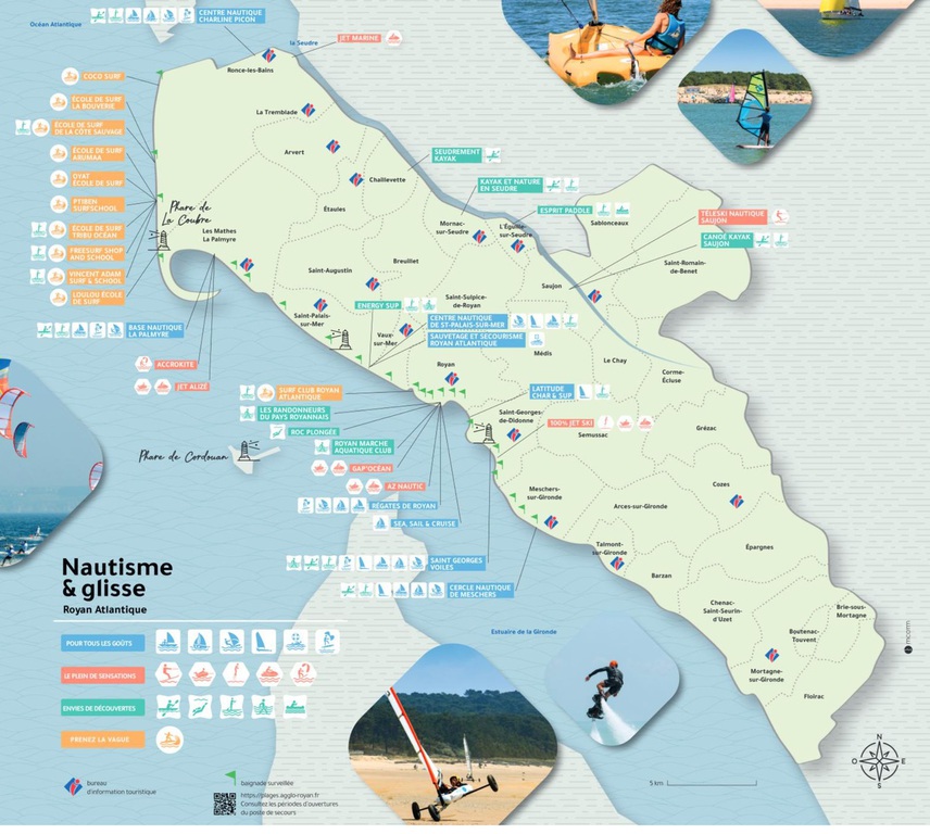 Activités sportives : Notre région est une des premières destinations de France dans les activités nautiques : voici un échantillon des activités possibles : Bouée tractée ; Canoë Kayac ; Surf ; Kitesurf ; Jet-ski ; Plongée ; Pêche en mer ; Ski nautique ; Planche à voile ; Marche aquatique ; Char à voile Etc...